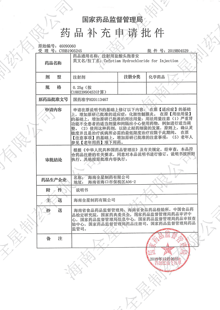 經(jīng)過(guò)公司研發(fā)團(tuán)隊(duì)長(zhǎng)期循證醫(yī)學(xué)研究,并結(jié)合上市原研藥品使用說(shuō)明書(shū),我公司向國(guó)家藥品監(jiān)督管理局提交的注射用奧美拉唑鈉、注射用鹽酸頭孢替安(4種規(guī)格)和注射用頭孢呋辛鈉(3種規(guī)格)適應(yīng)癥的補(bǔ)充申請(qǐng)近日獲得批準(zhǔn),新核準(zhǔn)的藥品使用說(shuō)明書(shū)拓展了臨時(shí)用藥范圍,用法用量描述更詳細(xì)更為安全,提供了更加嚴(yán)謹(jǐn)?shù)挠盟幰罁?jù),有助于臨床醫(yī)生在一線工作中制定出更準(zhǔn)確、更有效、更有針對(duì)性的治療方案。今后,公司將繼續(xù)提高研發(fā)力量,加強(qiáng)技術(shù)生產(chǎn)工藝,嚴(yán)把質(zhì)量關(guān)口,為市場(chǎng)提供更多高品質(zhì)、高標(biāo)準(zhǔn)的優(yōu)質(zhì)產(chǎn)品,為2030年健康夢(mèng)中國(guó)夢(mèng)添磚加瓦,獻(xiàn)上我司的一份努力。